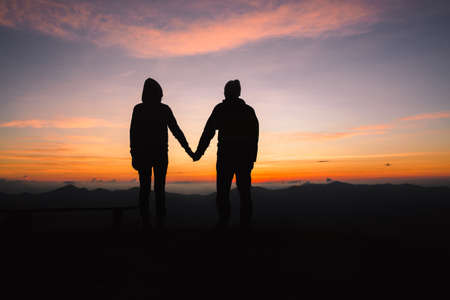 silhouette of a man and woman holding hands with each other with a beautiful sunset in background. happy lifestyle concept.