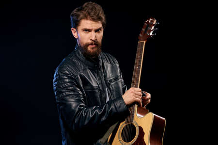 A man with a guitar in his hands leather jacket music performance rock star modern style dark background