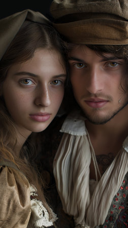 Portrait of a beautiful young couple in medieval clothes. Studio shot.