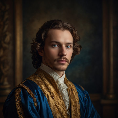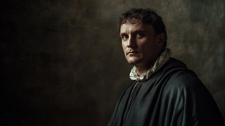 A dramatic portrait of a man in Renaissance attire. The dark background enhances the subject's intense expression.