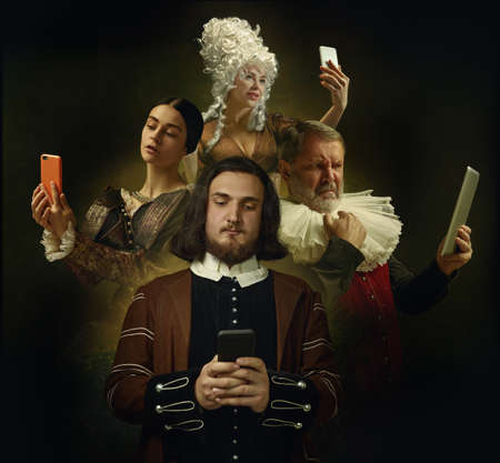 Collage with medieval people as royalty persons in vintage clothing on dark background. Concept of comparison of eras, modernity and renaissance, baroque style.