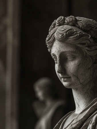 Ancient Roman figures engaged in modern conversation while dining in a classical setting with marble sculptures and antique decor