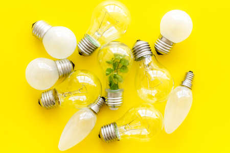 Energy saving light bulb with green plant inside, top view