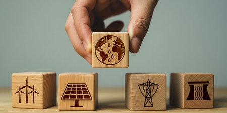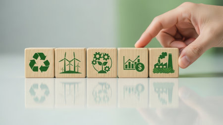 The image features a set of wooden blocks, each with a different sustainable energy symbol. The symbols include a recycling sign, wind turbines, a tree, a house with a solar panel, and an industrial factory. The blocks are arranged in a row, and a hand is reaching out to touch the block with the recycling sign. The image has a transparent background, making it suitable for various digital applications.