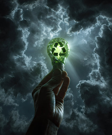 A hand holds a glowing lightbulb featuring a recycling symbol against a backdrop of dramatic, dark clouds. The image utilizes an overhead perspective and contrasts light and shadow. The vibrant green of the bulb and symbol stands out. Suitable for commercial projects that explore energy, environmentalism, and eco-consciousness.