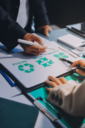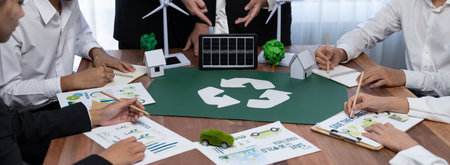 Group of business people planning and discussing on recycle reduce reuse policy symbol in office meeting room. Green business company with eco-friendly waste management regulation concept.Trailblazing