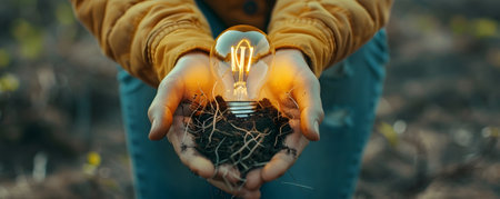 This captivating image depicts a hand holding a glowing light bulb with roots extending from the hand and delving into the earth below The symbolism is clear ideas and innovations are grounded in our