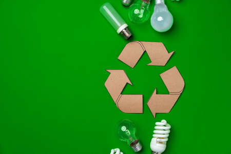 Light bulb and recycling sign on green background