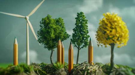 Trees, pencils, and windmills symbolizing engineering and sustainable project design, combining nature with renewable energy technology in a creative concept.