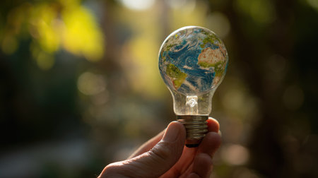 A hand holds a light bulb with a miniature globe of the Earth inside. The image showcases a concept of sustainable energy and environmental conservation. The composition features soft lighting and a blurred natural backdrop, creating a symbolic representation suitable for various uses.