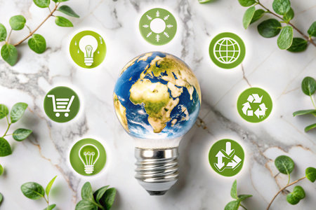 Earth lightbulb, sustainable icons, marble surface, eco-friendly concept