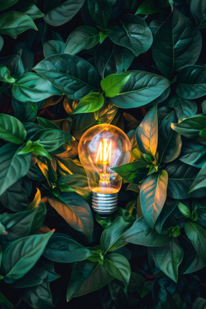 Glowing Light Bulb Amidst Lush Green Leaves.