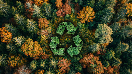 Recycling symbol in green nature with trees and forest background. Ecological concept . Generative AI.