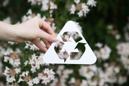 holding paper cut miniature recycle symbol over blooming tree