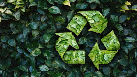 A creative depiction of the green recycling symbol surrounded by leaves, illustrating the concept of eco-conscious living and the importance of waste recycling.