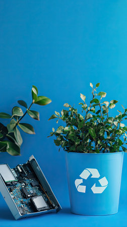 A blue pot with a recycling symbol holds a green plant, while a disassembled electronic device lies nearby, emphasizing the importance of recycling electronics for a sustainable future.