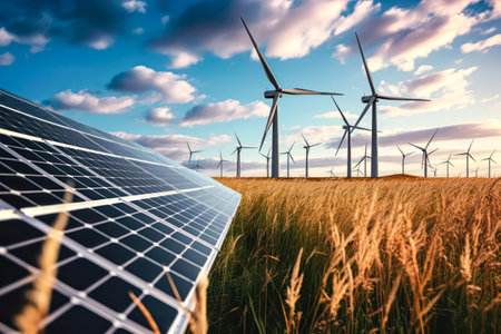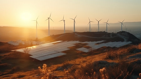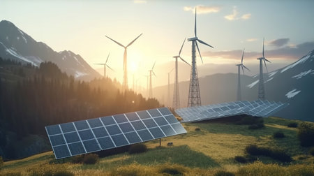 coexistence of wind and solar energy. Wind turbines and solar panels in a green landscape, demonstrating the potential of sustainable collaboration for a cleaner future