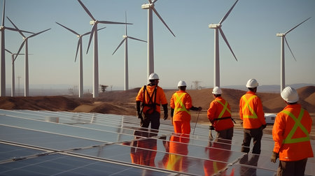 Renewable Energy Revolution - A power plant or wind farm with workers installing new equipment to generate renewable energy sources for the future