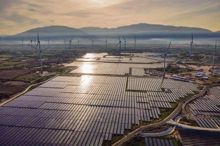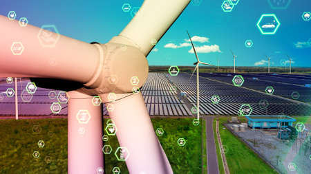 Solar panels and wind turbines in a power plant. Renewable energy concept.