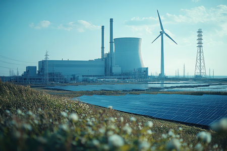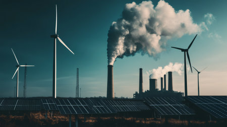 Wind turbines and solar panels in the foreground contrast with a coal fired power plant emitting smoke, highlighting the conflict between renewable and traditional energy sources