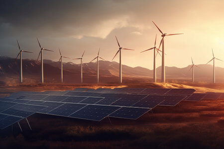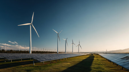 A landscape showcasing wind turbines and solar panels generating clean, renewable energy under a clear blue sky. A sustainable power solution for the future.