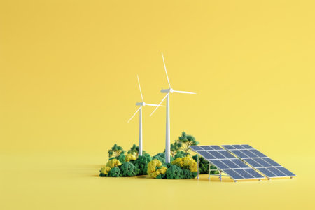 Solar panels and wind turbine illustrating green planet and renewable energy. Standard visual concept capturing the harmony of sustainable power sources.