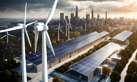 Explore a close-up view of sustainable urban infrastructure showcasing solar panels and wind turbines against a modern skyline, emphasizing eco-friendly energy solutions.