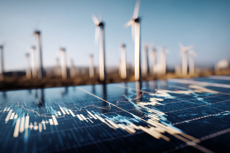 Double exposure of stock market graph with solar panels and wind turbines for sustainable growth