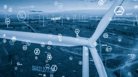 Rotating wind turbine blades spinning across wind farm at sunset, with chart bars and numeric data. Renewable, sustainability, energy, tech, infrastructure, ecology, environmental