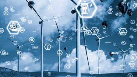 Green sustainable energy windmill power turbine electricity generators on rolling hills with clouds and blue sky and solar cells