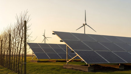 Wind turbines spinning alongside solar panels in a seamless blend of technology and nature under crisp daylight.