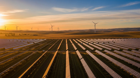 Rows of solar panels and distant wind turbines are bathed in the warm golden light of sunset across a rural landscape, signifying renewable energy production.