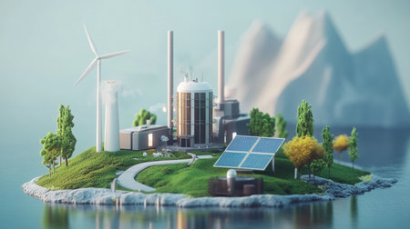 A creative display of eco-friendly technology featuring a solar panel, a wind turbine, and a miniature tree on a mossy island, emphasizing sustainability and nature's beauty.