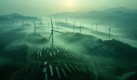 Aerial view of wind turbines in foggy field with mountains in background, green energy concept
