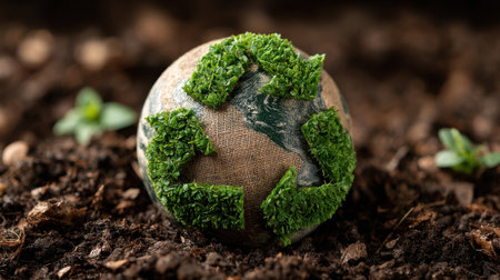 A globe representing Earth is adorned with a green recycling symbol, nestled in rich soil. Small plants sprout around it, highlighting the importance of sustainability and environmental care.