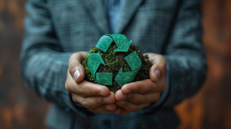 An icon of the circular economy holds a businessman holding the circular economy concept for future growth and environmental sustainability.