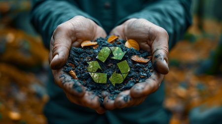 A vibrant recycling symbol set against a rich backdrop of autumn leaves and dark earth, emphasizing eco-friendliness and nature's beauty. Perfect for sustainability themes.