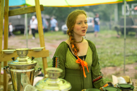 GRISHINO, RUSSIA - JUL 30, 2016: Unidentified participants of the Festival of folk culture Russian Tea. Festival held annually in Grishino ecovillage since 2012.
