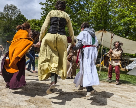 Nogent le Rotrou,France, 12.05.2013: Group of medieval people dancing in front of traditional tents during the Percheval Medieval Festival, near Saint Jean Castle in Nogent le Rotrou.