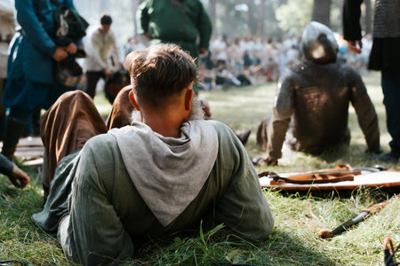 Rear view of a viking warrior in an old costume resting on the grass. Historical reconstruction of a medieval battle.