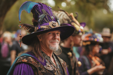 Cosplayer wearing a vibrant wizard costume, smiling joyfully while participating in a lively fantasy festival parade filled with magic and celebration