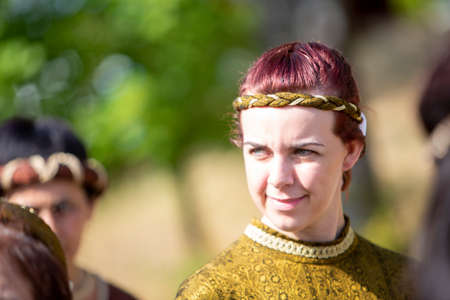 Russia, Vyborg, 30,07,2011 A woman in historical clothing at the Festival of the historical reconstruction of the Middle Ages Vyborg Castle