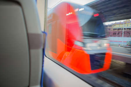 Train in motion. Fast, dynamic, travel. Speed, transportation, railway, movement, close up.