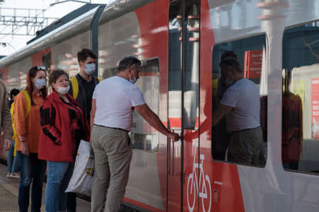 Moscow, Russia - August 2021: Man wearing a mask to prevent viruses on the platform while waiting to board the aeroexpress.
