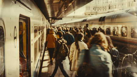 Film-like appearance, people in a subway or train station, crowded platform, taken from behind.