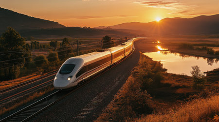 Experience a stunning sunset view featuring a sleek train gliding alongside tranquil waters, set against a backdrop of majestic mountains and vibrant skies.