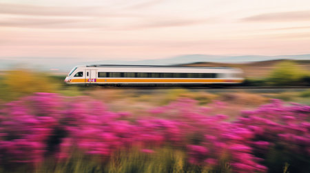 A dynamic shot of a train in motion, captured against a vibrant natural landscape with blooming flowers, showcasing travel and the beauty of nature.