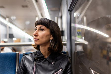 public transport passenger. Young woman riding in a modern subway car. Beautiful girl in a jacket riding in the subway.