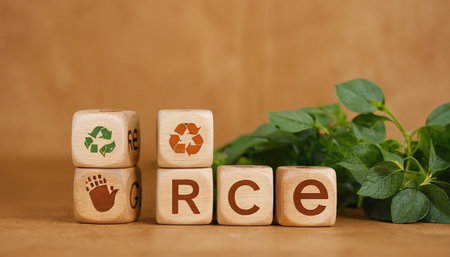Wooden cubes with the word recycle and green plants on a brown background