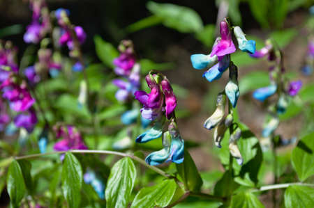 Purple flowers of Lathyrus vernus, spring vetchling, spring pea or blooming spring vetch in spring garden
